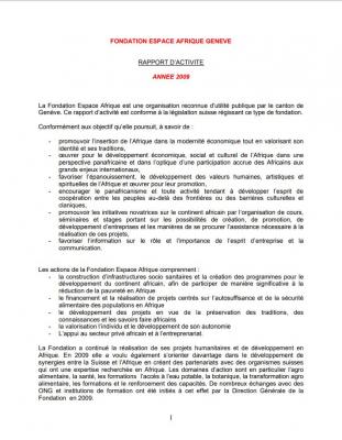RAPPORT ANNUEL 2009L’année 2009 a été marquée par le développement de partenariats qui ont permis de donner une impulsion nouvelle aux activités de la Fondation Espace Afrique. Il est important de souligner le rôle joué par les structures universitaires en Suisse et au Bénin dans le cadre des projets de valorisation des produits agricoles. La Fondation Espace Afrique a accentué ses actions en faveur de l’appui aux populations défavorisées dans la création de leurs propres activités génératrices de revenus.Mais l’impulsion donnée aux projets de développement n’a pas diminué l’engagement de la Fondation à s’impliquer dans les activités humanitaires au travers de ses projets de santé primaire et d’éducation dans les zones défavorisées. La Fondation Espace Afrique remercie tous les partenaires et les personnes qui l’ont aidée à réaliser ses objectifs tout au long de cette année 2009. La Fondation exprime particulièrement sa gratitude aux autorités suisses pour leurs mesures incitatives à l’investissement humanitaire et de développement en Afrique. < Retour |